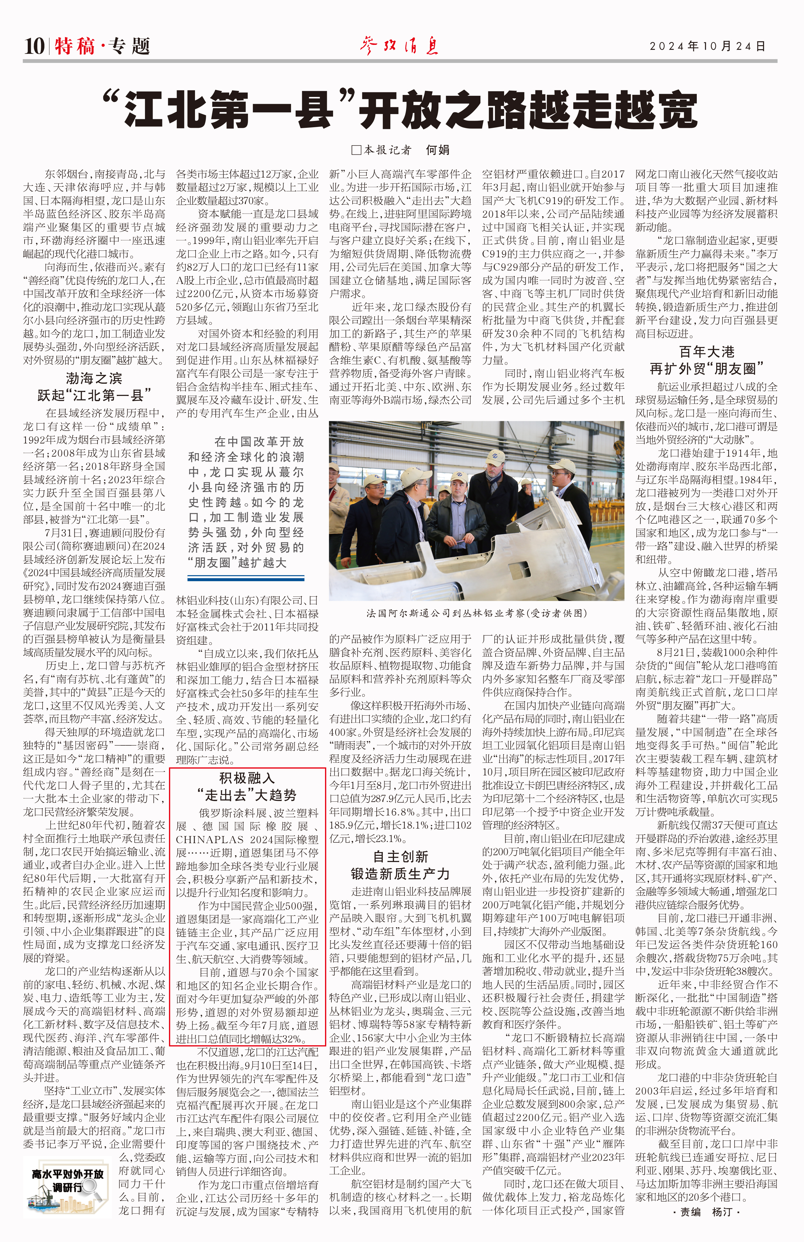 10月24日出版的《參考消息》,聚焦“江北第一縣”——龍口的“開放之路”,點贊道恩集團積極融入“走出去”大趨勢,對外貿易額逆勢上升,積極參與全球化市場競爭。